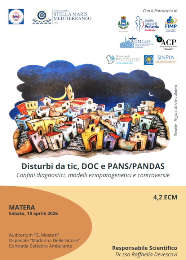 Sabato 18 aprile 2026 Matera ospiterà il convegno dal titolo “Disturbi da tic, Doc e Pans/Pandas: confini diagnostici, modelli eziopatogenetici e controversie” nell’Auditorium dell’Ospedale “Madonna delle Grazie”.