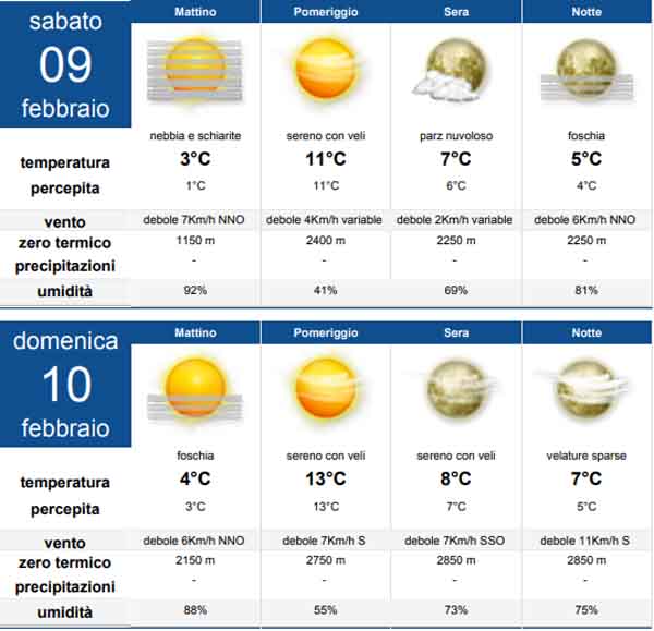 Durante la giornata la temperatura massima registrata sarà di circa 11°C, la minima di 3°C, lo zero termico si attesterà a 2025m.