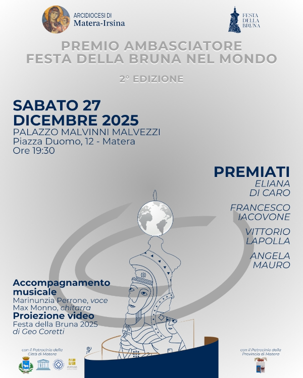 L’evento si terrà sabato 27 dicembre 2025 alle ore 19.30, nella cornice storica di Palazzo Malvinni Malvezzi, in Piazza Duomo a Matera, alla presenza delle istituzioni civili e religiose, con il patrocinio della Città di Matera e della Provincia di Matera, e in collaborazione con l’Arcidiocesi di Matera-Irsina.