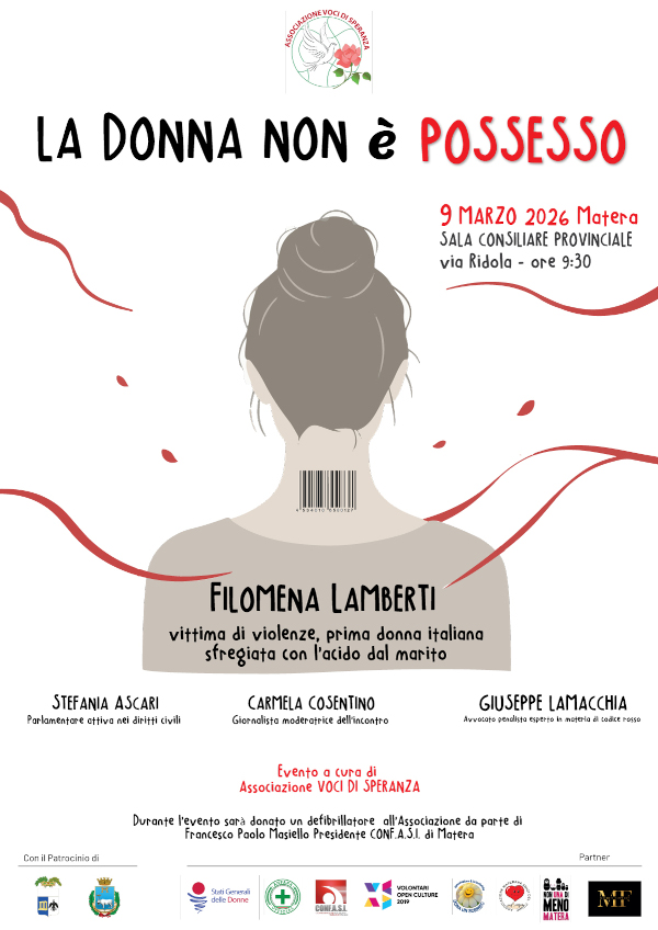 Lunedì 9 marzo 2026, alle ore 9:30, la Sala Consiliare Provinciale di Matera in via Ridola ospiterà l’evento dal titolo “La donna non è possesso”.