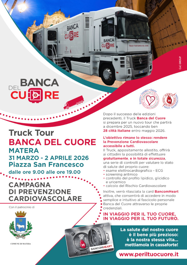 Dal 31 marzo al 2 aprile il Jumbo Truck di Banca del Cuore, appositamente allestito, tornerà a fare tappa in Basilicata, per offrire ai cittadini la possibilità di sottoporsi ad uno screening cardiologico completo e gratuito che prevede: