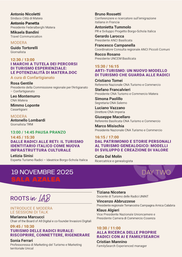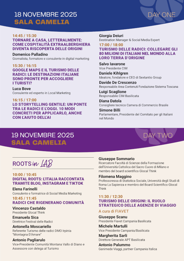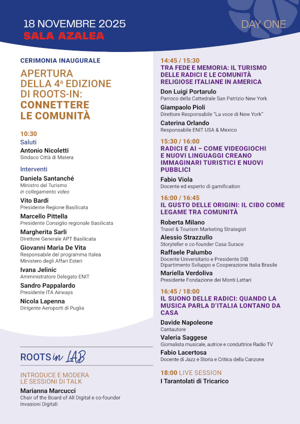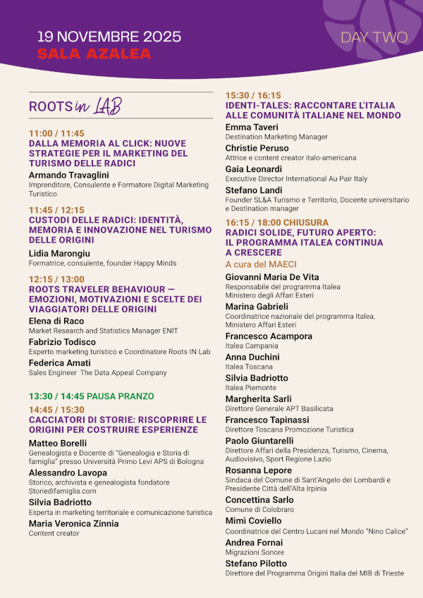 La due giorni prevede, dopo la cerimonia inaugurale del 18 mattina, la partecipazione di 60 relatori impegnati in 24 laboratori tematici, i Roots-IN LABs, con talk, tavole rotonde e approfondimenti per strutturare e potenziare l’offerta turistica legata al rapporto tra Italia e comunità italiane all’estero e dedicati al familysearch, all’intelligenza artificiale, alla genealogia, alle esperienze delle Italae e molto altro. Ospite d’eccezione sarà anche una testata d’oltreoceano “La Voce di New York”.
