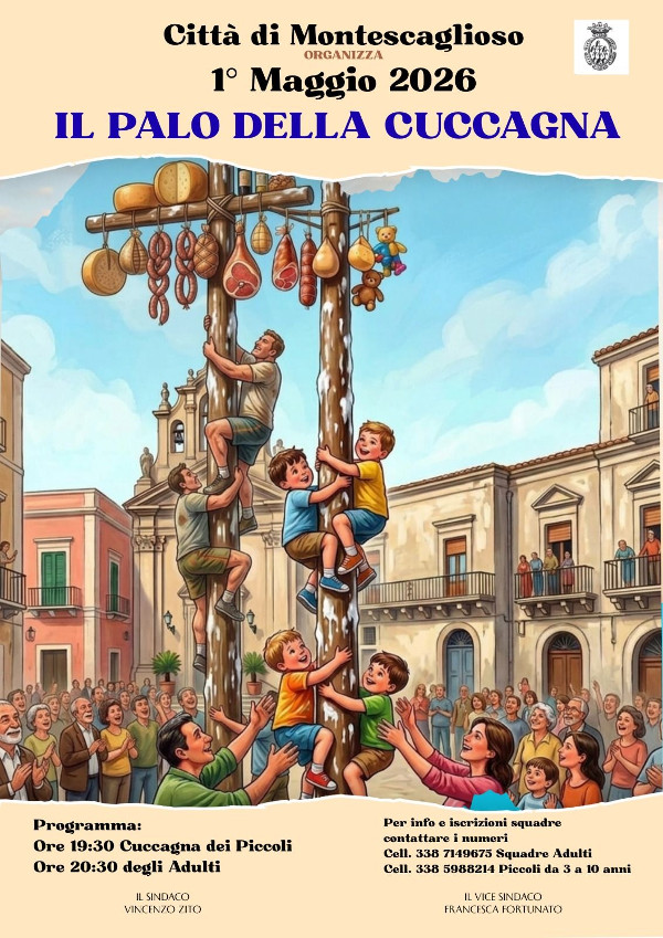Anche quest’anno l’Amministrazione Comunale organizza e supporta il gioco tradizionale della “Scalata del Palo della Cuccagna” che ha sempre caratterizzato il giorno del 1 Maggio a Montescaglioso: