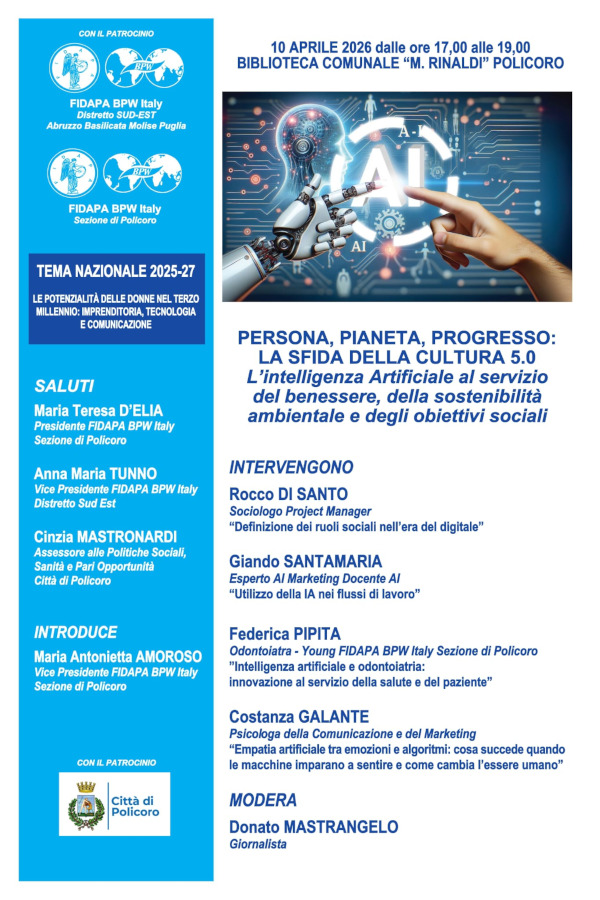 Il 10 aprile alle ore 17.00 presso la Biblioteca Comunale Massimo Rinaldi di Policoro si terrà il Convegno su “Persona,pianeta, progresso:la sfida della cultura 5.0. L’Intelligenza Artificiale al servizio del benessere umano, della sostenibilità ambientale e degli obiettivi sociali”.
