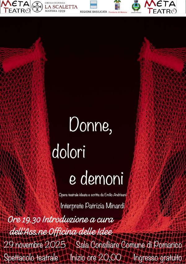 La Meta Teatro, con il supporto morale del Circolo Culturale La Scaletta Matera 1959 e con il patrocinio della Regione Basilicata, della Provincia di Matera e del Comune di Pomarico, presenta un nuovo e intenso appuntamento teatrale destinato a lasciare un segno profondo nel pubblico.
