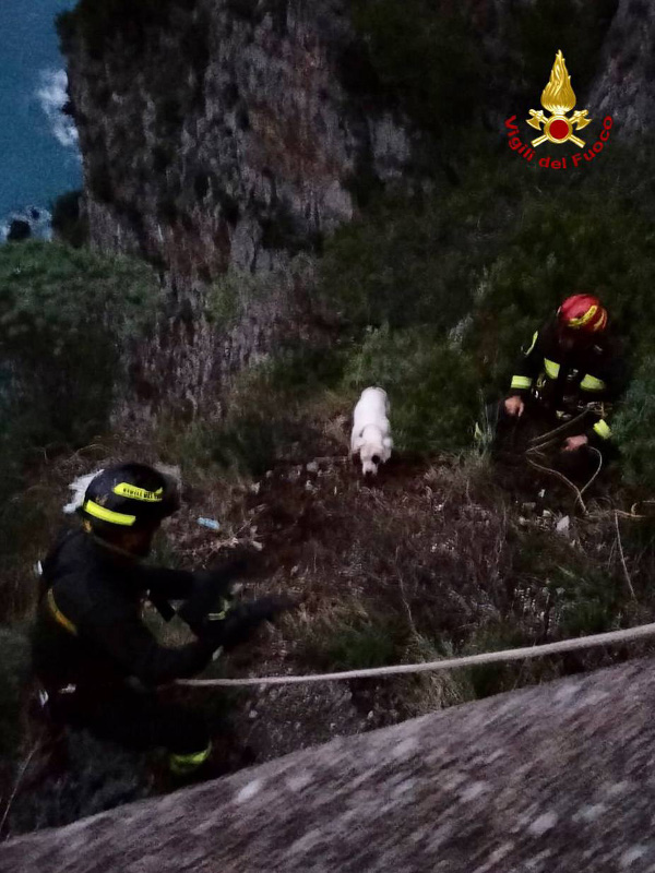 I Vigili del Fuoco, allertati da alcuni operai che stavano lavorando sulla strada statale, si sono calati lungo le rocce utilizzando tecniche spelo-alpino ed hanno raggiunto il cane.