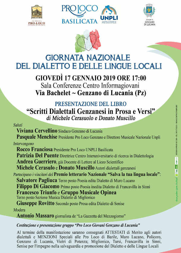 Giovedì 17 Gennaio alle ore 17:00, nella Sala Conferenze del Centro Informagiovani di Genzano di Lucania (PZ), si celebra la “Giornata Nazionale del Dialetto e delle Lingue Locali”, promossa dal Comitato Pro Loco Unpli Basilicata per tutelare e valorizzare il patrimonio immateriale rappresentato dai dialetti e dalle lingue locali.