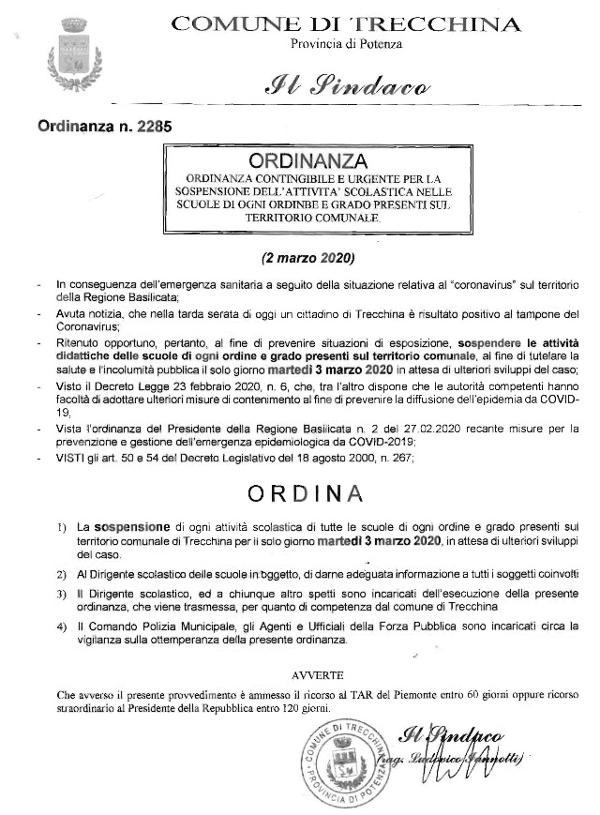“A seguito della notizia di un caso positivo riscontrato nel nostro comune, anche se al momento non comunicato per le vie ufficiali, ed in attesa di emettere i provvedimenti definitivi congiuntamente con le autorità sanitarie regionali abbiamo provveduto prioritariamente ad emettere ordinanza di chiusura delle scuole di ogni ordine e grado per il giorno 03 marzo 2020 al fine di sanificare gli ambienti scolastici.