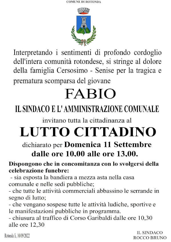 “Il Sindaco Rocco Bruno e l’Amministrazione Comunale, a nome dell’intera comunità rotondese, si stringono all’angoscia che ha colpito la famiglia Cersosimo – Senise per la prematura scomparsa del giovane Fabio.