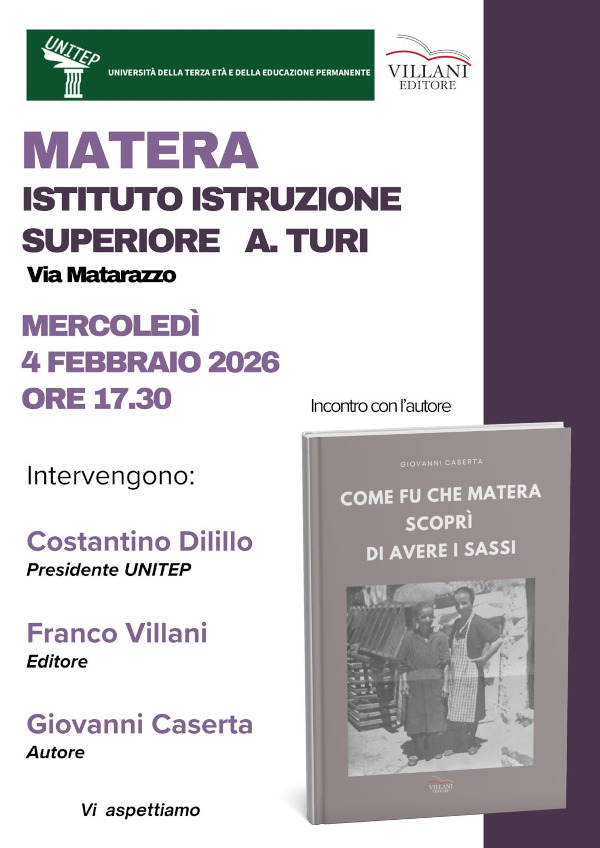 Mercoledì 4 febbraio 2026 alle ore 17:30 nell’aula magna dell’Istituto Alberghiero “A. Turi” di via Matarazzo, Matera, Unitep invita la cittadinanza a partecipare all’incontro con Giovanni Caserta, scrittore, storico e critico letterario che presenta il suo nuovo libro “Come fu che Matera scoprì di avere i Sassi” nel quale, attraverso testimonianze di autori e viaggiatori italiani e stranieri, si accompagna la vicenda dei Sassi fino ai giorni nostri, passando attraverso la loro scoperta quale “vergogna nazionale” di cui lentamente acquistano coscienza gli abitanti, gli ultimi ad accorgersene.