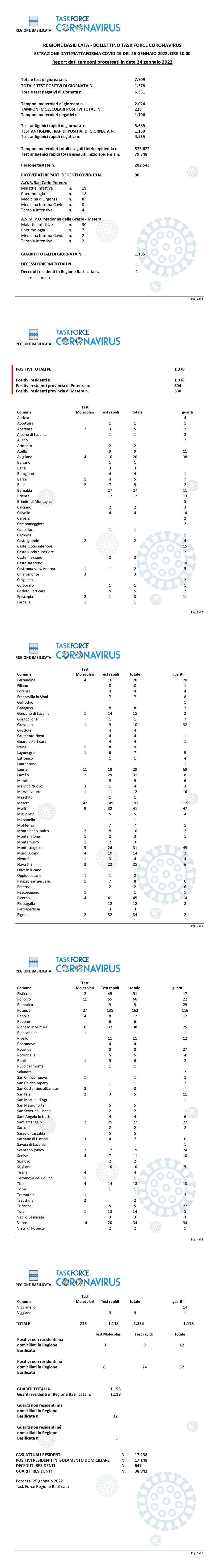 La task force regionale comunica che nella giornata di ieri, 24 gennaio, sono stati processati 7.709 tamponi (molecolari ed antigenici) per la ricerca di contagio da Covid-19, di cui 1.378 sono risultati positivi.