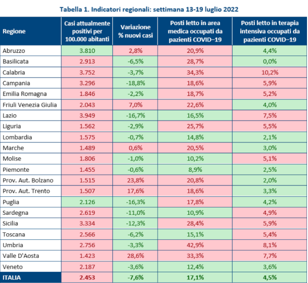 “In Basilicata, nella settimana dal 13 al 19 luglio, si registra una performance in peggioramento per: