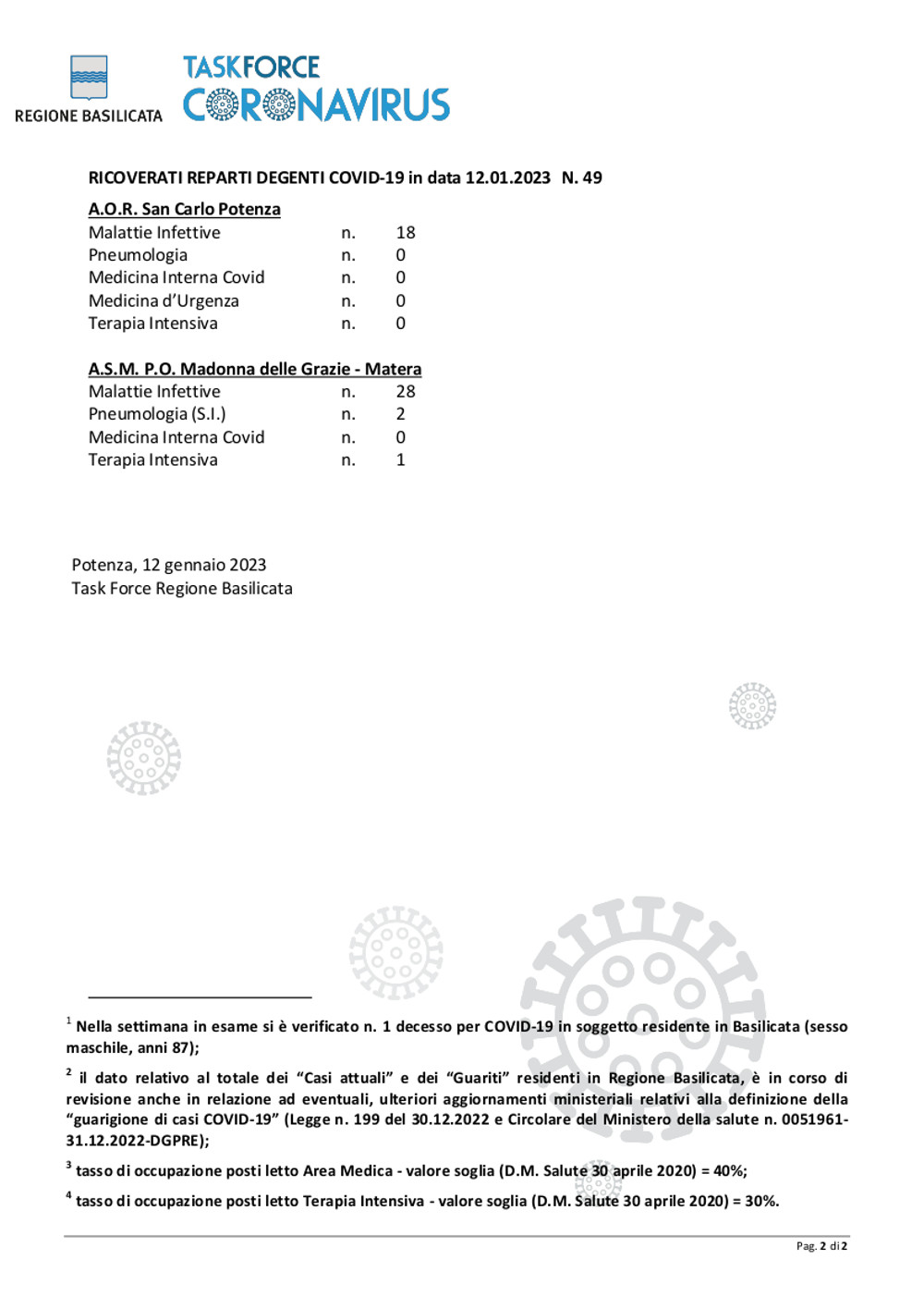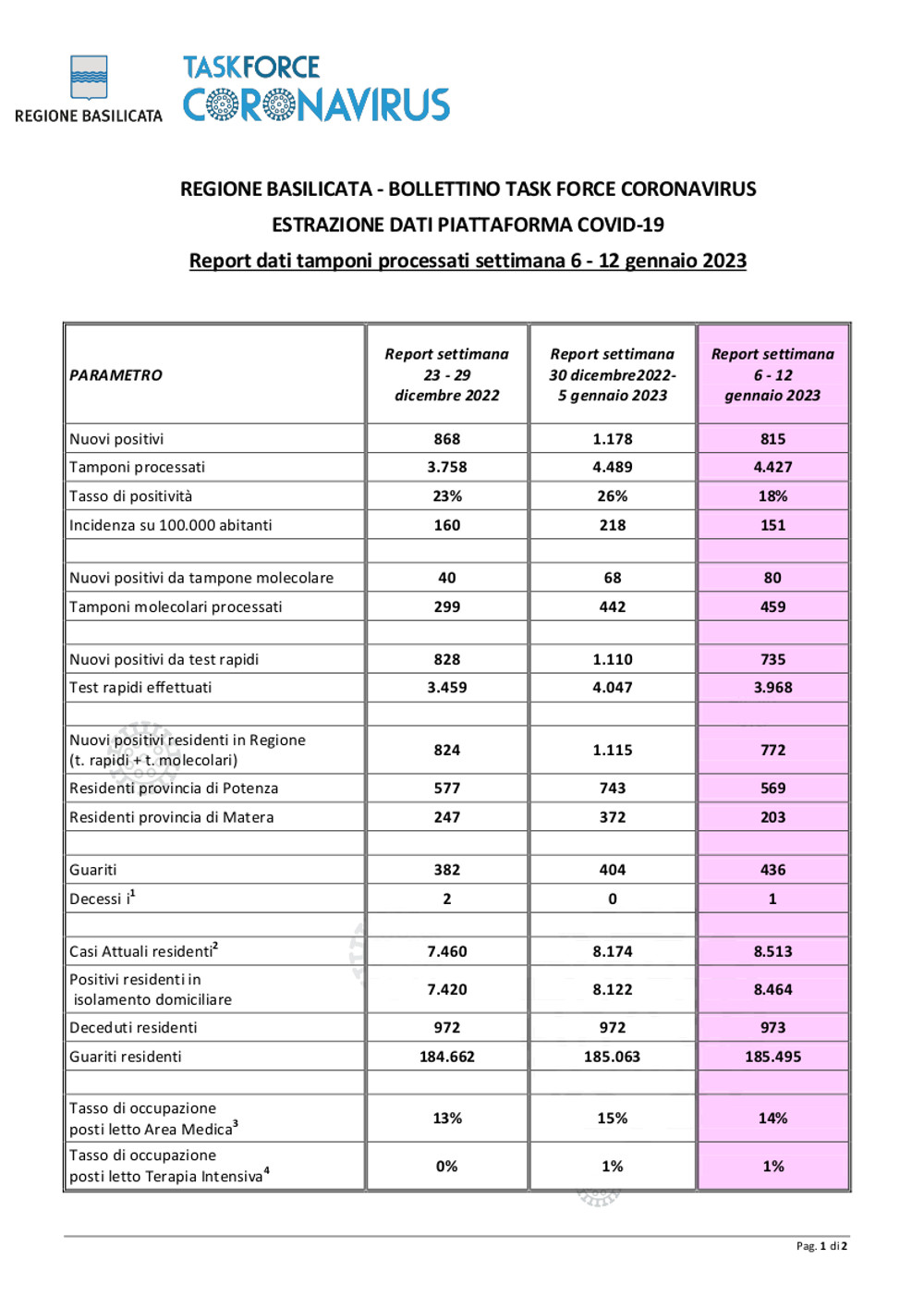La task force regionale comunica che nella settimana dal 6 al 12 Gennaio 2023, sono stati processati 4.427 tamponi (molecolari ed antigenici) per la ricerca di contagio da Covid-19, di cui 815 sono risultati positivi.