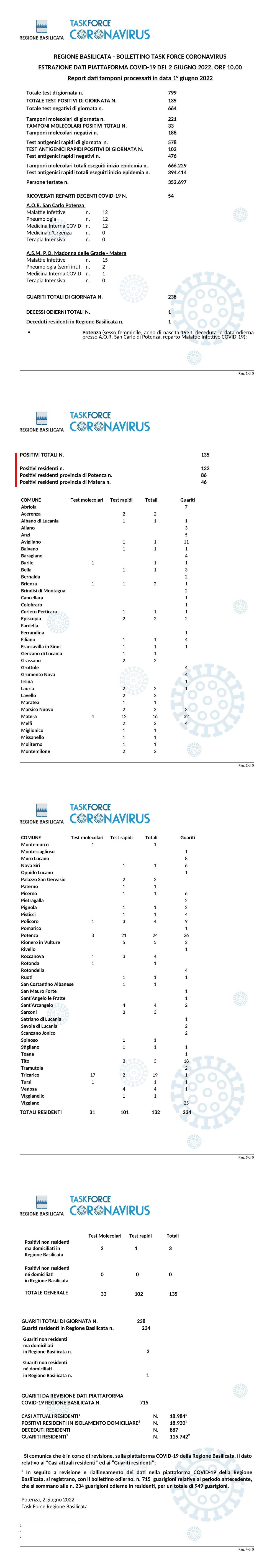 La task force regionale comunica che nella giornata di ieri 1 Giugno, sono stati processati 799 tamponi (molecolari ed antigenici) per la ricerca di contagio da Covid-19, di cui 135 sono risultati positivi.