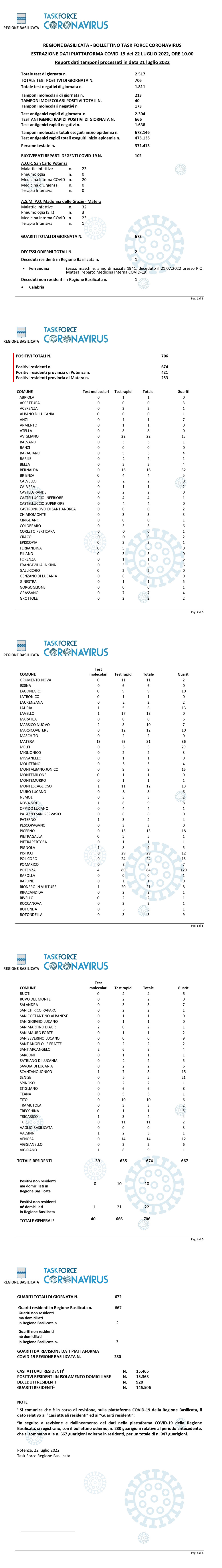 La task force regionale comunica che nella giornata di ieri 21 luglio, sono stati processati 2.517 tamponi (molecolari ed antigenici) per la ricerca di contagio da Covid-19, di cui 706 sono risultati positivi.