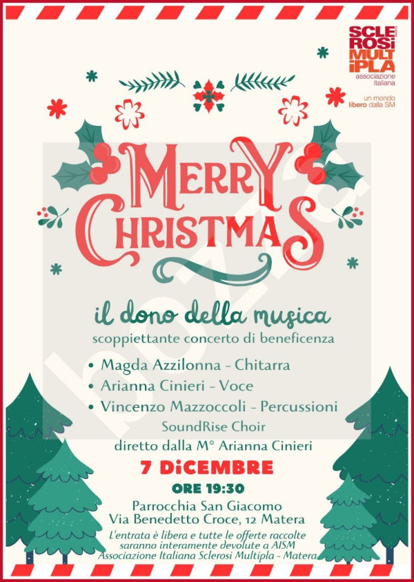 Lo scoppiettante concerto natalizio sarà un evento ad ingresso libero finalizzato a raccogliere offerte che saranno interamente devolute ad AISM, Associazione Italiana Sclerosi Multipla, sezione di Matera.