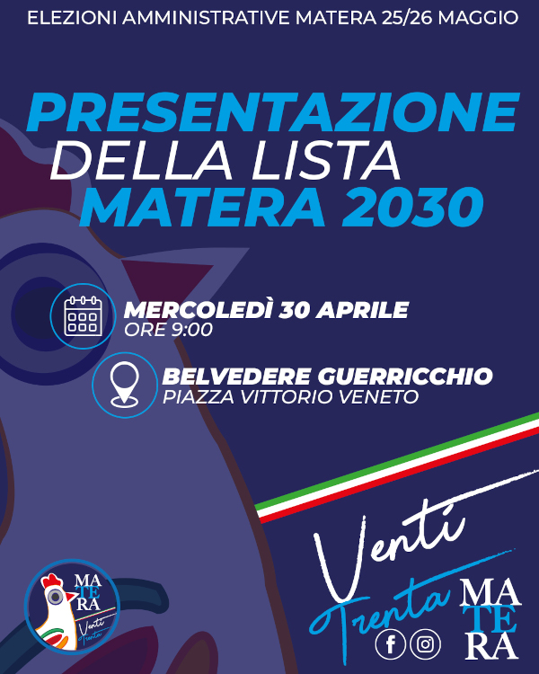 “Sarà un momento aperto a tutta la cittadinanza, in un clima di festa e partecipazione, attraverso cui spiegheremo la mission e la vision, oltre le motivazioni politiche, che animano Matera 2030, gruppo costituito da persone serie, competenti e concrete.