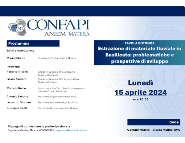 Per discutere di questo argomento nelle sue diverse implicazioni – economiche, sociali e ambientali – Confapi Aniem ha organizzato una tavola rotonda sul tema dell’estrazione di materiale fluviale in Basilicata, con la partecipazione dei rappresentanti dei Dipartimenti Ambiente e Infrastrutture, dell’Unibas, di Legambiente e degli Ordini professionali dei Geologi e degli Ingegneri.