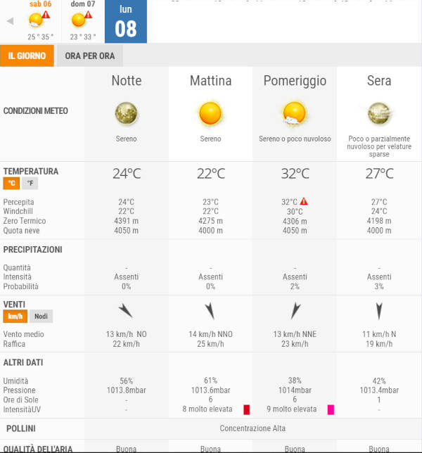 Martedì 9 Agosto, invece, avremo cieli in prevalenza poco nuvolosi, con nubi in contenuto aumento dal tardo pomeriggio, non sono previste piogge.