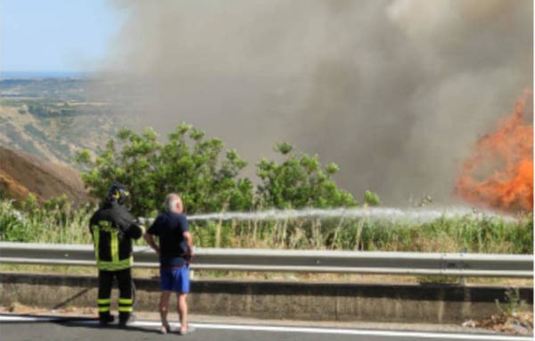 “Siamo ancora impegnati, da diverse ore, nelle operazioni di spegnimento del vasto incendio che sta interessando l’ingresso del nostro paese nella zona del Sacro Cuore.