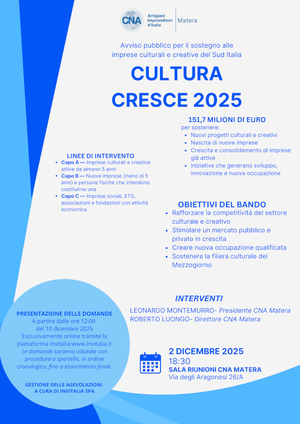 Il 2 dicembre 2025 alle ore 18:30 presso la Sala Riunioni CNA, in via degli Aragonesi 26/A, CNA Matera organizza un incontro informativo dedicato alla presentazione del nuovo avviso pubblico “Cultura Cresce 2025”, il programma con cui il Ministero della Cultura mette a disposizione 151,7 milioni di euro per sostenere le imprese culturali e creative del Sud Italia.