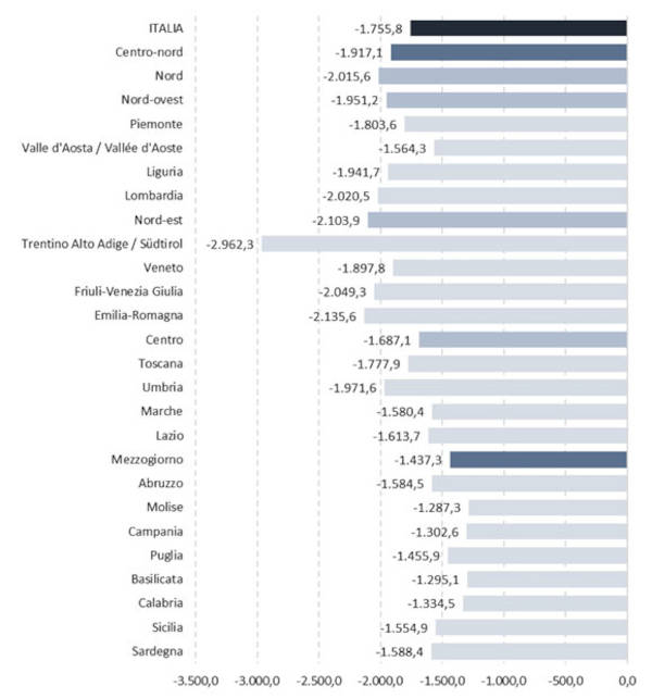 Tra giugno 2019 e giugno 2022, il reddito pro-capite è diminuito in valore assoluto soprattutto nel Nord est -2.104 euro, ma i dati vanno contestualizzati e con una inflazione di questo genere sono le regioni del Mezzogiorno che rischiano di essere doppiamente penalizzate non solo a causa dell’incremento dei prezzi, ma anche per il minor livello dei redditi e a causa della composizione del paniere di consumo poiché al Sud la componente alimentare e di prima necessità costituisce la composizione principale dei consumi, infatti è in particolare nel Mezzogiorno che il tasso d’inflazione sul reddito pro-capite disponibile incide in maniera più generalizzata.