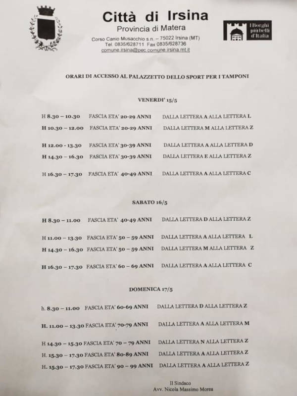 E’ iniziato questa mattina lo screening di massa per i cittadini del Comune di Irsina.
