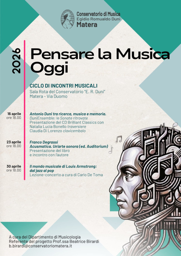Il Conservatorio di Musica “Egidio Romualdo Duni” di Matera presenta “Pensare la Musica Oggi”, un ciclo di incontri promosso dal Dipartimento di Musicologia che intende offrire al pubblico e alla comunità accademica uno spazio di riflessione, approfondimento e confronto sui linguaggi musicali, tra passato e contemporaneità.