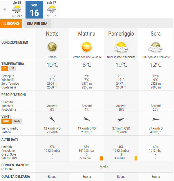 La temperatura massima registrata dovrebbe essere di 19°C, la minima di 9°C.