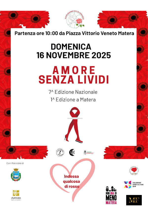 Matera ospita per la prima volta la Camminata “Amore Senza Lividi”, giunta alla 7ª edizione nazionale e alla 1ª edizione materana, un’iniziativa di sensibilizzazione contro tutte le violenze, in particolare quelle sulle donne e per la promozione di una cultura del rispetto, dell’amore autentico e della libertà.