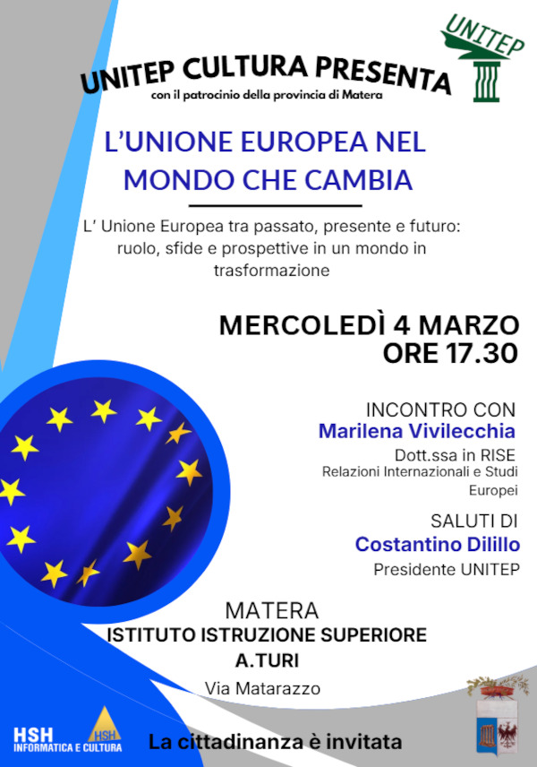 Mercoledì 4 marzo 2026 alle ore 17.00 nell’Aula Magna dell’Istituto Alberghiero Turi di Matera è in programma l’incontro sul tema “L’Unione Europea nel Mondo che cambia” con Marilena Vivilecchia, nell’ambito dei Mercoledì di Unitep Cultura, attività di partecipazione alla vita intellettuale, sociale, scientifica del territorio che consistono in incontri di natura formativa e informativa, con il mondo del sapere.