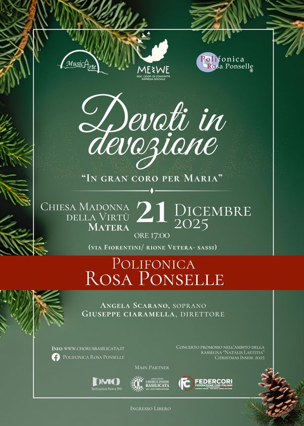 Domenica 21 Dicembre alle ore 17:00, a Matera la Chiesa di Madonna delle Virtù Nuova [in via fiorentini, angolo rione vetera] ospita il concerto “In gran coro per Maria” della Polifonica “Rosa Ponselle”, diretta dal maestro Giuseppe Ciaramella, anche docente presso il Conservatorio “E.R. Duni” di Matera.