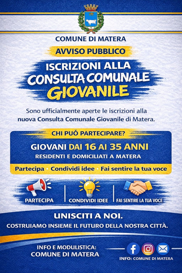 Il Comune di Matera apre ufficialmente i termini per l’iscrizione alla Consulta Giovanile, con la pubblicazione di un apposito avviso pubblico rivolto ai giovani del territorio.