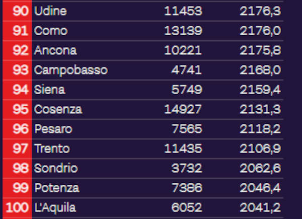 Matera al 59/o posto e Potenza al 99/o: è la posizione delle due province della Basilicata.
