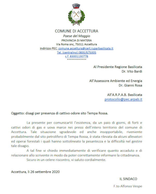 La presente per comunicarVi l’esistenza, da un paio di giorni, di forti e cattivi odori di gas e uova marce nei pressi dell’intero territorio del comune di Accettura.