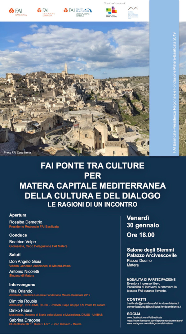 La Presidenza Regionale FAI Basilicata con la Delegazione di Matera e la Fondazione Matera-Basilicata 2019 il 30 gennaio alle ore 18.00 promuovono, presso il Salone degli Stemmi del Palazzo Arcivescovile di Matera, l’evento rivolto a un pubblico eterogeneo e a cittadini nati all’estero, che vivono stabilmente a Matera e che siano interessati a partecipare alle attività interculturali proposte dal FAI Basilicata e dalla Fondazione Matera Basilicata 2019 nel territorio.
