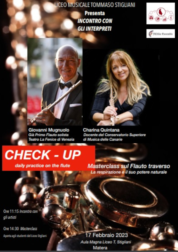 “è davvero una preziosa e imperdibile occasione per gli studenti del Liceo musicale di Matera, i quali avranno modo di confrontarsi con i due maestri attraverso interviste sulla loro carriera e sulla professione del musicista e del didatta e successivamente, nel primo pomeriggio, grazie ad una masterclass proposta dai due interpreti, cimentarsi con il vasto repertorio orchestrale per flauto traverso, senza tralasciare il potere naturale della respirazione nell’esecuzione e interpretazione musicale.