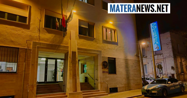La facciata della Questura di Matera è illuminata di arancione, colore scelto come simbolo di un futuro senza violenza basata sul genere.