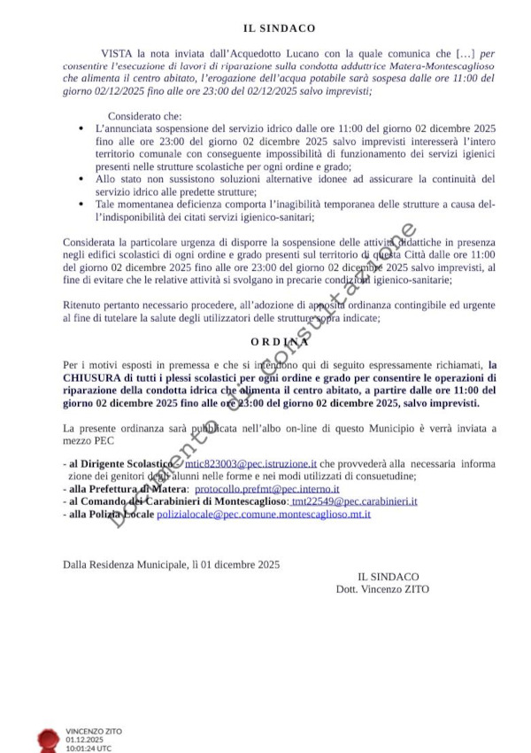 Il Comune di Montescaglioso comunica che, in seguito a comunicazione di Acquedotto Lucano di sospensione idrica dalle ore ore 11.00 alle ore 23.00 del giorno 2 dicembre 2025, con Ordinanza Sindacale n. 116/2025 è predisposta la chiusura di tutte le scuole dalle ore 11.00 di domani 2 dicembre 2025.