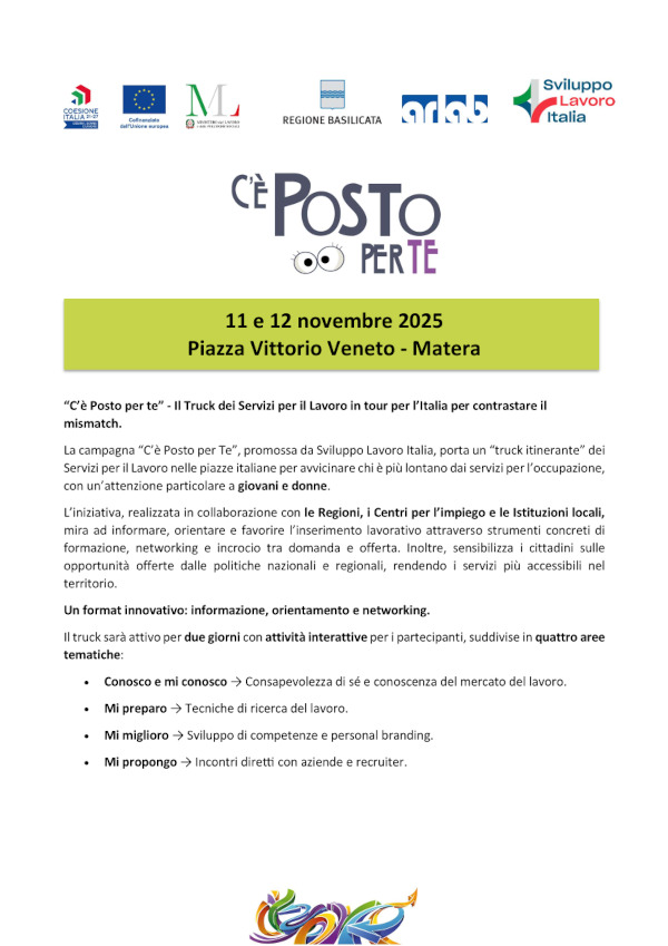 Martedì 11 e mercoledì 12 novembre 2025, farà tappa a Matera in Piazza Vittorio Veneto, la campagna nazionale “C’è Posto per Te”, promossa da Sviluppo Lavoro Italia, società in house del Ministero del Lavoro e delle Politiche Sociali, che porta nelle piazze italiane un truck itinerante dei Servizi per il Lavoro per avvicinare chi è più lontano dai servizi per l’occupazione, con un’attenzione particolare a giovani e donne.