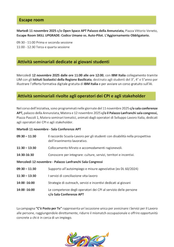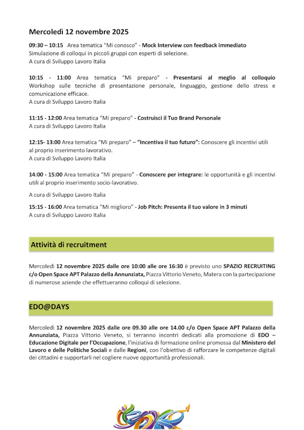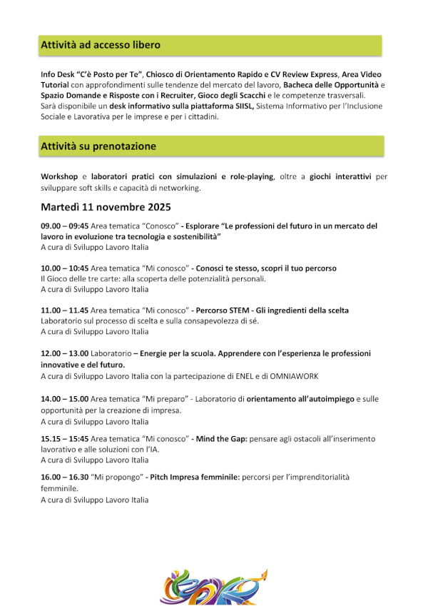 Due giornate di attività in presenza, ad accesso libero e su prenotazione: informazione, orientamento, networking, workshop operativi, laboratori pratici, role-playing, incontri con esperti di selezione, iniziative di educazione digitale, attività per studenti, seminari tematici rivolti agli operatori dei CPI e agli stakeholder.