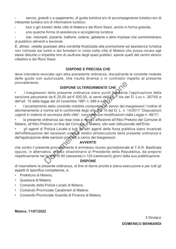 E’ necessario che tutte le forze dell’ordine si possano adoperare compatibilmente con i propri mezzi e risorse a contrastare, questi indebiti comportamenti tenuti in danno dei turisti, che sono e vengono in visita nella città di Matera, da parte delle guide abusive o dei finti informatori turistici, così da evitare ogni tipo di disturbo ai medesimi visitatori ed una lesione all’immagine ed al decoro della Città.