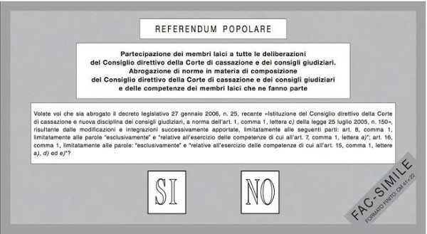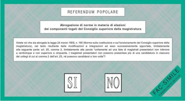 In sostanza il quesito chiede se si è d’accordo o meno all’abrogazione della norma che prevede l’obbligo di raccogliere da 25 a 50 firme per potersi candidare come membri dell’Organo di autogoverno della magistratura.