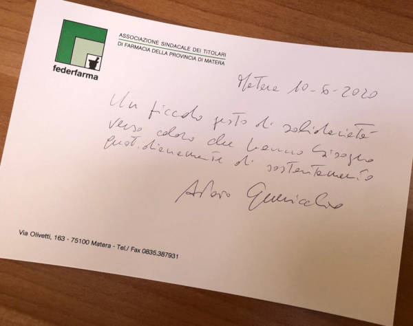 Il 10 Giugno 2020 il presidente di Federfarma, Antonio Guerricchio, ha consegnato alla presidente della Caritas di Matera, Anna Maria Cammisa e alla presidente dell’Associazione Cittadini Solidali, Pina Giordano, i fondi raccolti, accompagnati da un biglietto con su scritto: un piccolo gesto di solidarietà verso coloro che hanno bisogno quotidianamente di sostentamento”.