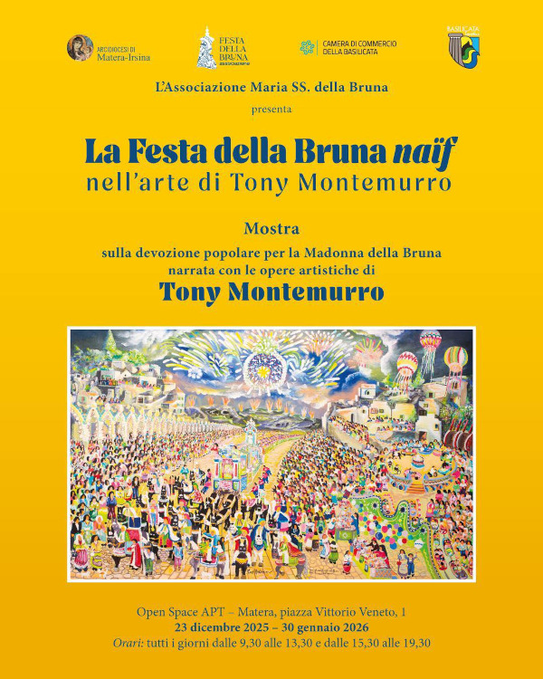 Fino al 30 gennaio 2026, l’Open Space dell’APT Basilicata, in piazza Vittorio Veneto a Matera (Palazzo dell’Annunziata), ospita la mostra “La Festa della Bruna naïf” con le opere di Tony Montemurro.