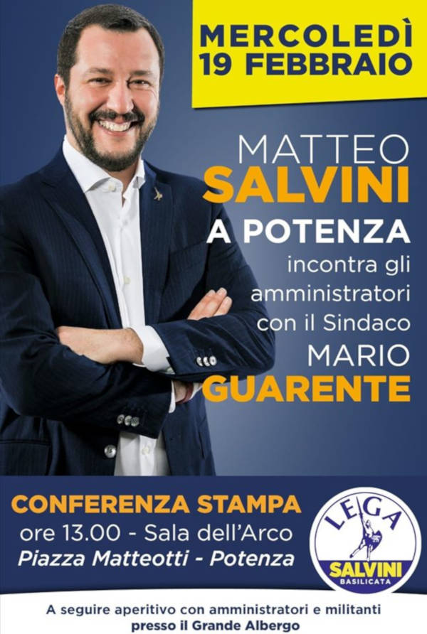 “Domani, 19 Febbraio, alle 13:00, il Senatore Matteo Salvini sarà a Potenza per incontrare gli amministratori locali e i militanti!”.