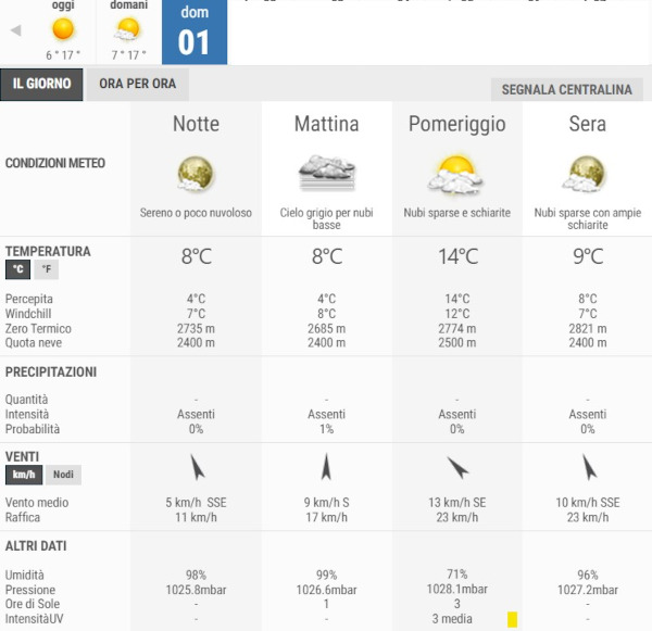 Domenica 1 Marzo avremo cieli molto nuvolosi o coperti con ampi rasserenamenti dal tardo pomeriggio fino a cieli sereni o poco nuvolosi, non sono previste piogge.