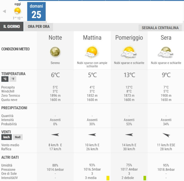 Invece, Giovedì 25 Dicembre avremo cieli in prevalenza poco nuvolosi, salvo variabilità dal pomeriggio, non sono previste piogge.