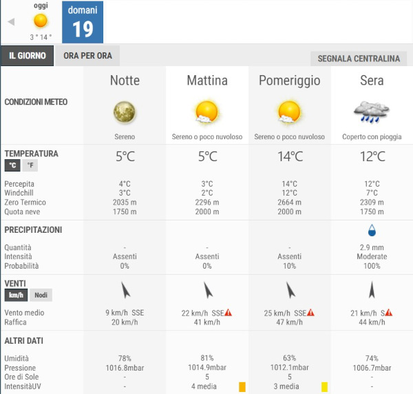 Secondo gli esperti di 3bmeteo, domani 19 Febbraio, avremo cieli in prevalenza poco nuvolosi, ma con nubi in aumento serale fino a cieli nuvolosi o molto nuvolosi e deboli piogge.
