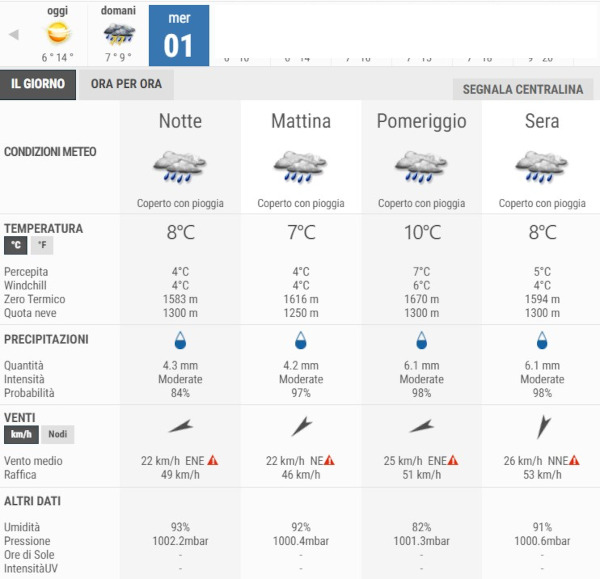 Mercoledì 1 Aprile avremo cieli molto nuvolosi o coperti con deboli piogge per l’intera giornata.